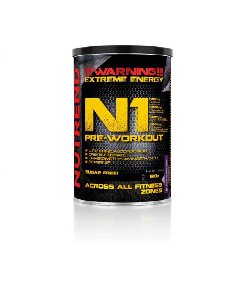 Pre-workout: meer uithoudingsvermogen, energie en kracht! N1 Pre-workout is een fantastisch product om het lichaam voor te bereiden op een zware training of wedstrijd. De nieuwe pre-workout N1 van Nutrend is bedoeld voor zowel kracht- als de uithoudingsprestatie te vergroten en geeft energie en kracht tijdens de hele training of wedstrijd. Kan gebruikt worden door alle sporters en staat voor een bron van nieuwe kracht, energie en, nog belangrijker, een geweldig gevoel omdat je jouw training goed hebt volbracht. Deze effectieve pre-workout sportdrank bevat na bereiding per portie de volgende waardevolle bestandsdelen: Beta-alanine (3500 mg) zorgt gedeeltelijk dat de ophoping van melkzuur in de spiercellen wordt geremd waardoor normaal een prestatie achteruit gaat. L-arginine-alfa-ketoglutaraat (3500 mg) versterkt het immuunsysteem en verbetert de doorbloeding. Het heeft het grootste aandeel stikstof uit het hele spectrum van aminozuren en is een belangrijk onderdeel van complexe eiwitten. Creatine (3235 mg) voor meer explosieve kracht en een minder snel verzuring te ervaren in de spieren tijdens een krachttraining. L-citruline L-malaat (2250 mg) voor een positief effect van het uithoudingsvermogen van de spieren en ondersteund spiertoename en spierherstel. Tyrosine (500 mg) speelt een belangrijke rol bij de creatie van eiwitten, maar dit aminozuur staat vooral bekend om zijn vermogen het humeur te verbeteren en stress te bestrijden. Cafeine (200 mg) geeft een boost en is goed voor de concentratie en focus. DMAE (dimethylaminoethanol) 20 mg heeft een positieve invloed op hersenengezondheid.